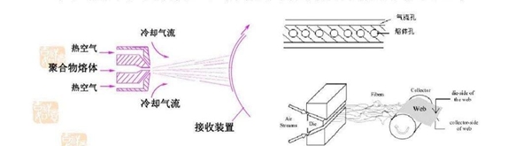 熔噴布的生產工藝便是熔噴非織造工藝,利用高速熱空氣對模頭噴絲孔擠出的聚合物熔體細流進行牽伸,由此形成超細纖維并凝聚在凝網簾或滾筒上,并依靠自身粘合而成為非織造布。
