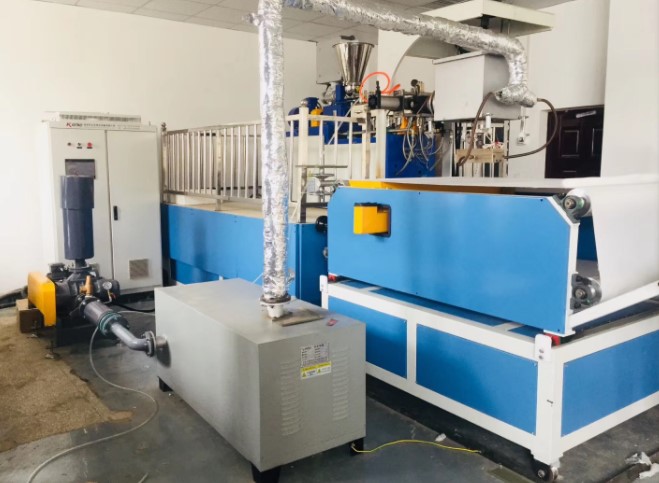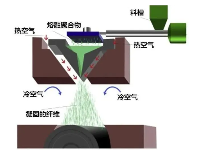 熔噴布的生產(chǎn)工藝分為:聚合物準(zhǔn)備→熔融擠壓→計(jì)量泵→熔噴模頭組合件→熔體細(xì)流拉伸→冷卻→接收裝置。