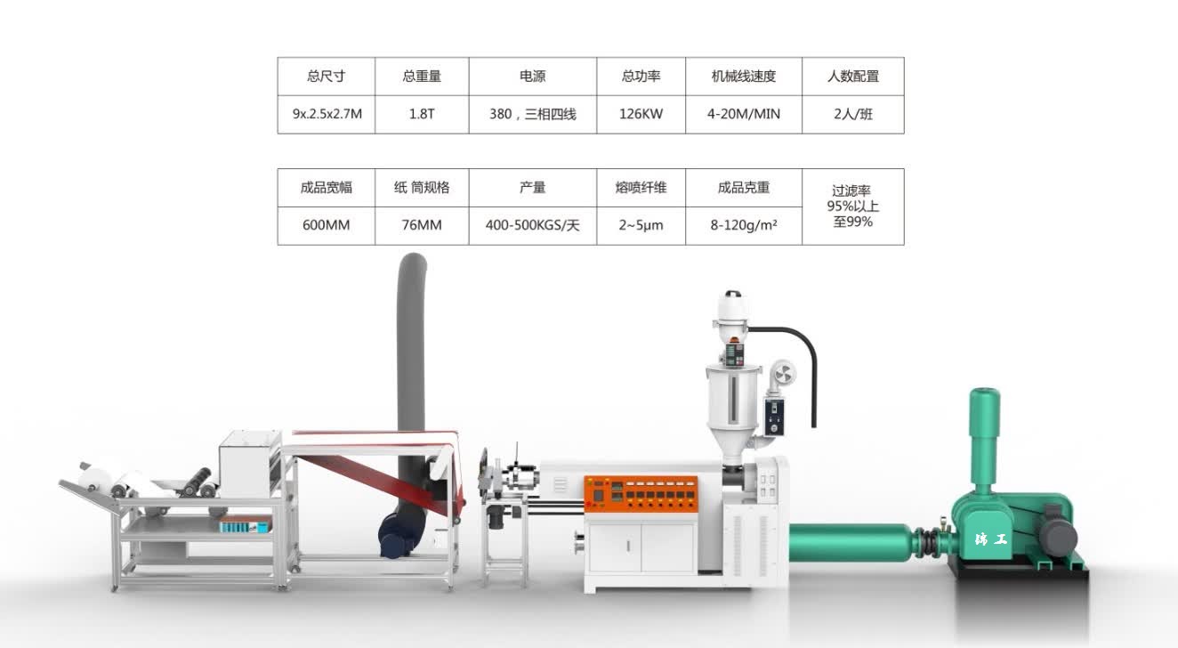 目前市場上面的設(shè)備大小生產(chǎn)線比較多,從300到3200mm寬幅都有,配置也是有很大的區(qū)別,熔噴布設(shè)備主要核心部件在于: ?羅茨鼓風(fēng)機(jī),空氣加熱器,自動(dòng)吸料烘干機(jī),單螺桿擠出機(jī),過濾器,熔體計(jì)量泵,噴絲模頭,接布臺(tái),靜電駐極機(jī),切布及卷布。