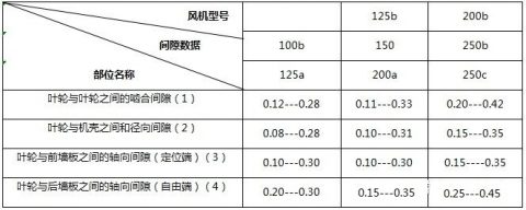 裝配間隙系20℃時(shí)的理論靜態(tài)間隙值。其能保證在額定工況下滿足動態(tài)時(shí)所需之工作間隙。為此,裝配間隙乃是保證風(fēng)機(jī)性能和安全運(yùn)用的重要因素。每臺羅茨風(fēng)機(jī)出廠時(shí),皆已對裝配間隙進(jìn)行調(diào)整,用戶不得隨意變動。具體間隙值見下表: