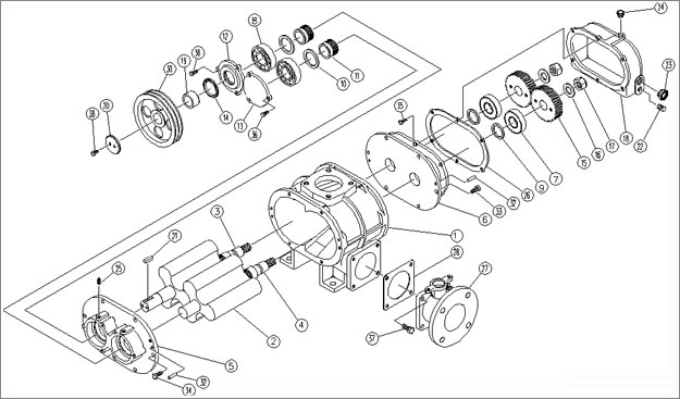 想要了解羅茨風(fēng)機的工作原理,必須對羅茨風(fēng)機的機頭結(jié)構(gòu)有充分的了解,機頭的主要組成部分有:墻板、機殼、主動葉輪、從動葉輪、主動從動齒輪、主副油箱、軸承等,為了大家對羅茨風(fēng)機的結(jié)構(gòu)有清洗的認(rèn)知,小編特意整理了一份結(jié)構(gòu)圖供大家參考,如下所示: